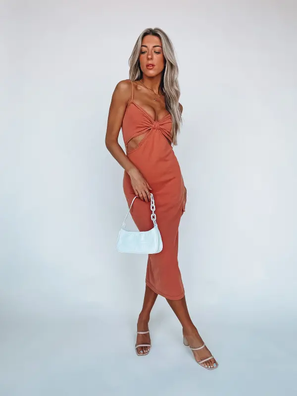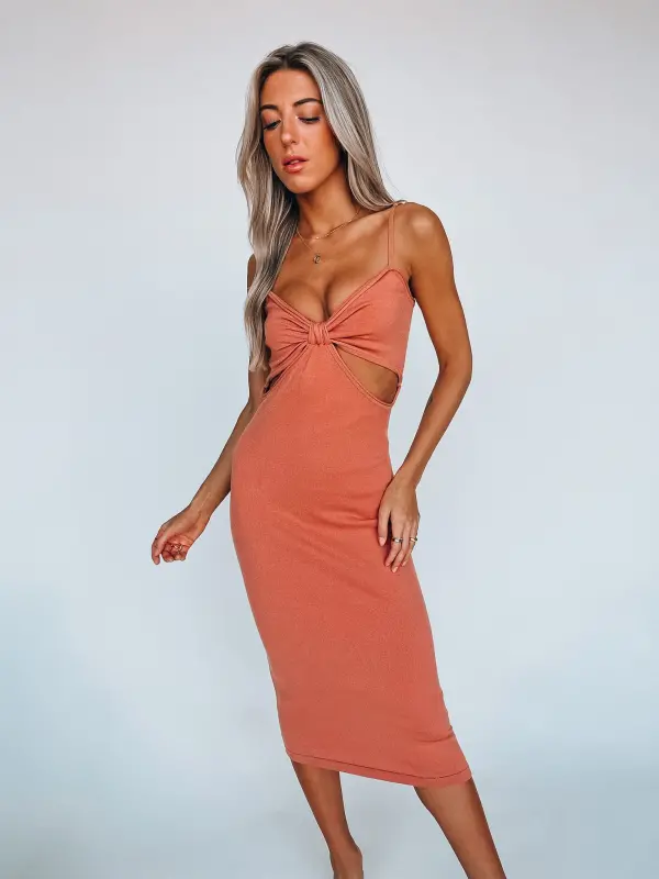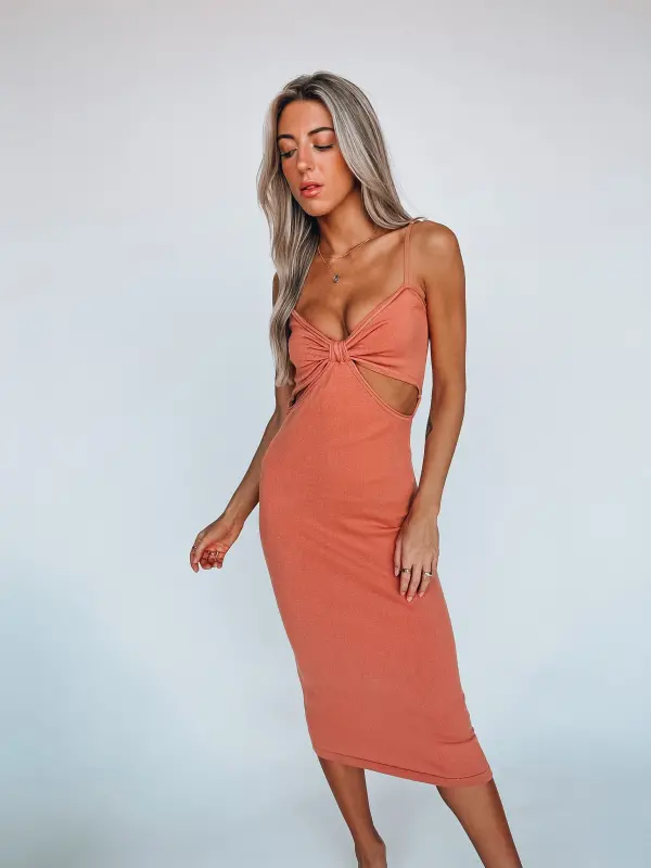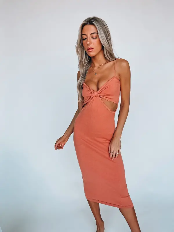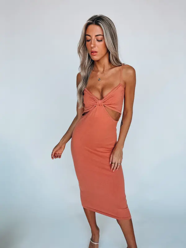 • Features: Adjustable straps, cut out detail on bodice, midi length, fitted silhouette