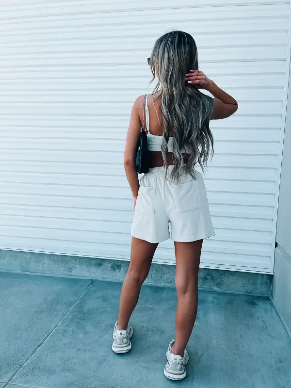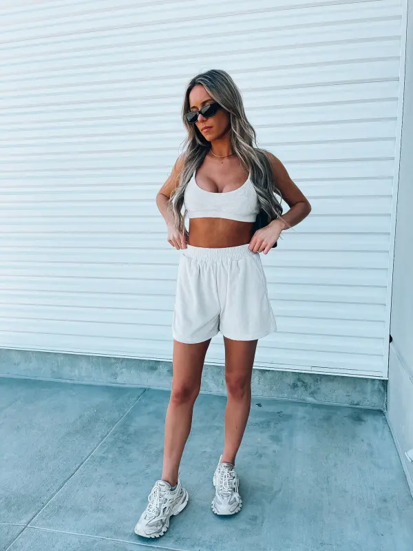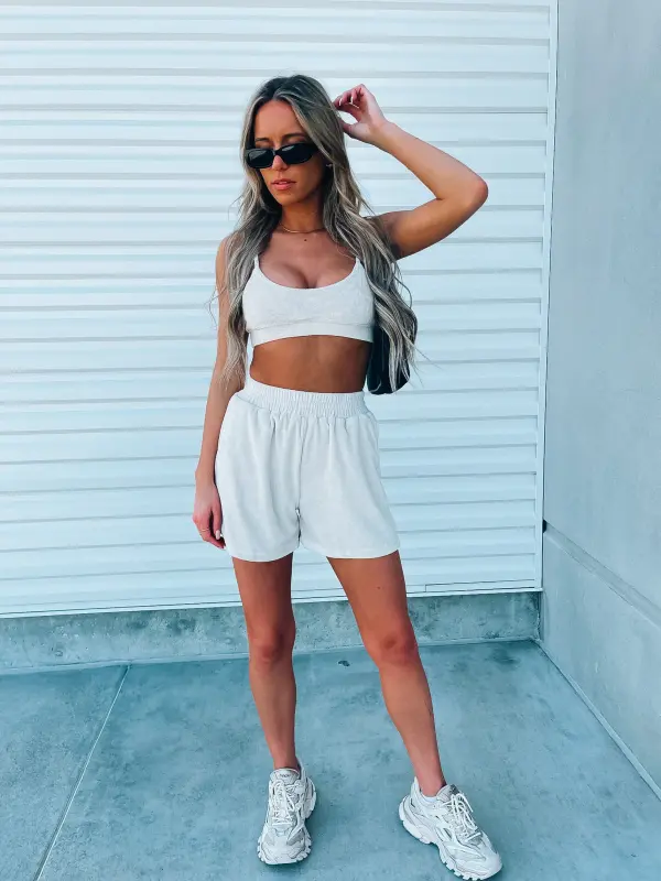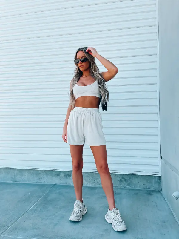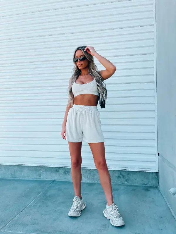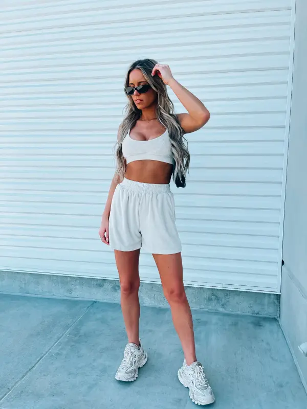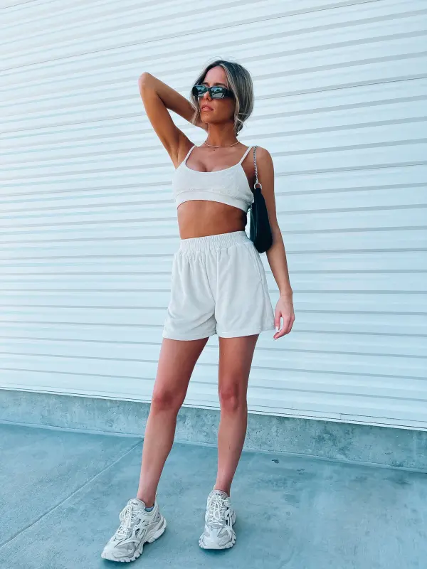 Our Beige Terry Cloth set features a bra top and relaxed fit longe shorts. This top features an elastic hem line for a more comfortable and slip free fit. The straps on this top are adjuatble which create a more customizable fit. The shorts in this set are high wasited and feature a thick elastic waistband, functional pocket detail throughout .