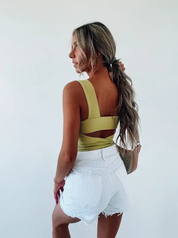 Our Long Away Around Tank In Pistachio is a cropped tank has a soft to the touch ribbed fabric. The back is the star of the show with this top with crossover back detail. This is a MUST HAVE item in your closet.