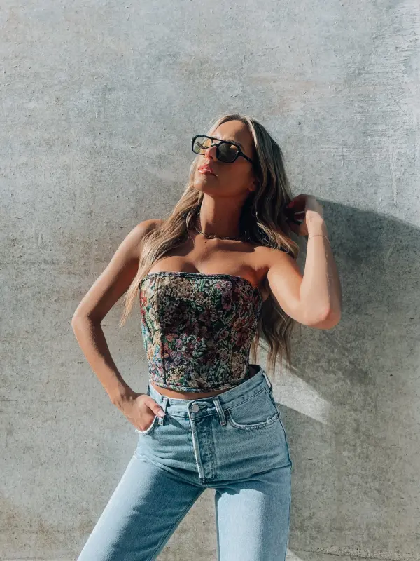 Our Nola Floral Corset Top is a strapless corset top that features a colorful dark floral print all thoroughout. This top is compleated with structural boning alll throughout to provide additonal support and figure flattering fit. The back of this top features fully adjuatable self tie detail that allows you to customize the fit to be perfect for you. This top is made out of a thick quilted material which gives that top a unique look. This top has no stretch so if in between sizes we recommend sizing up.