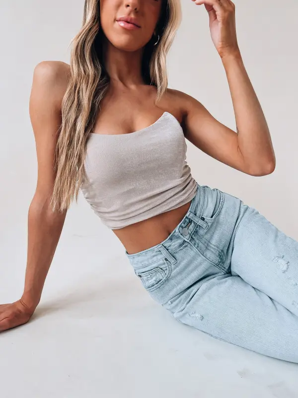 Our Taupe Ruched Fitted Crop has soft to the touch sheen fabric. There is boning detail on the front and back of this top to help keep its shape and to help it stay up. The sides on this crop are synched. The inside is LINED and there is a back zipper closure with a hook and eye clasp.